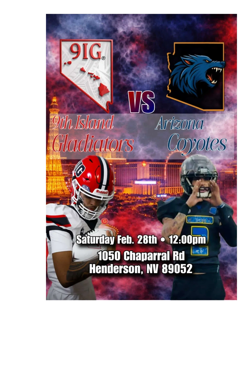 Our 1st Pre Season Game Feb 28TH we will be traveling to Vegas to take on the 9th Island Gladiators